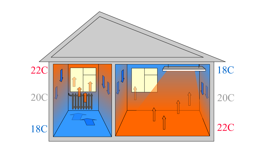 Устремляясь вниз, лучи первым делом прогревают напольное покрытие. За счет этого температура на уровне ног всегда на пару градусов выше, чем в районе головы.