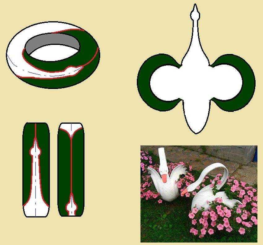 Схема выполнения лебедя из автомобильной покрышки.На заметку! Готовый цветник засыпают почвой, в нее сажают цветы. Для этих целей подойдут растения каскадного (петуния, пеларгония, тумбелина) или ампельного типа (те, что имеют гибкие побеги большой длины). Свешивающиеся побеги, усеянные цветами, выглядят очень красиво.