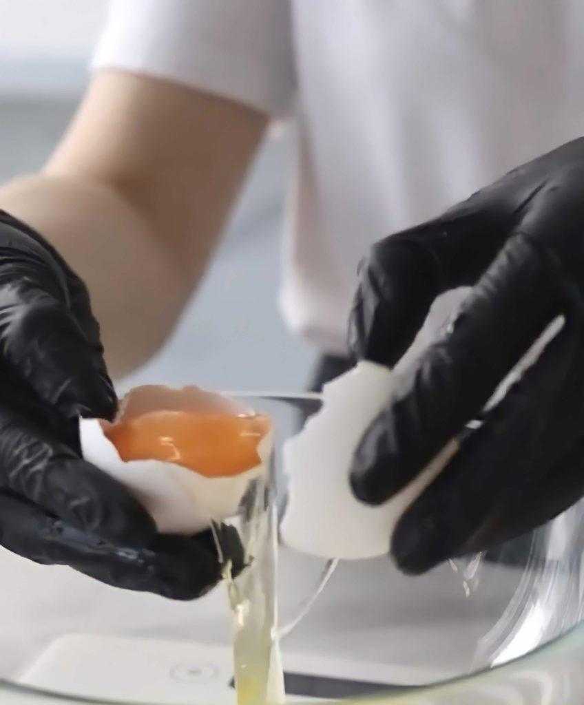 разделить скорлупу, перелить белок с желтком в чашку.