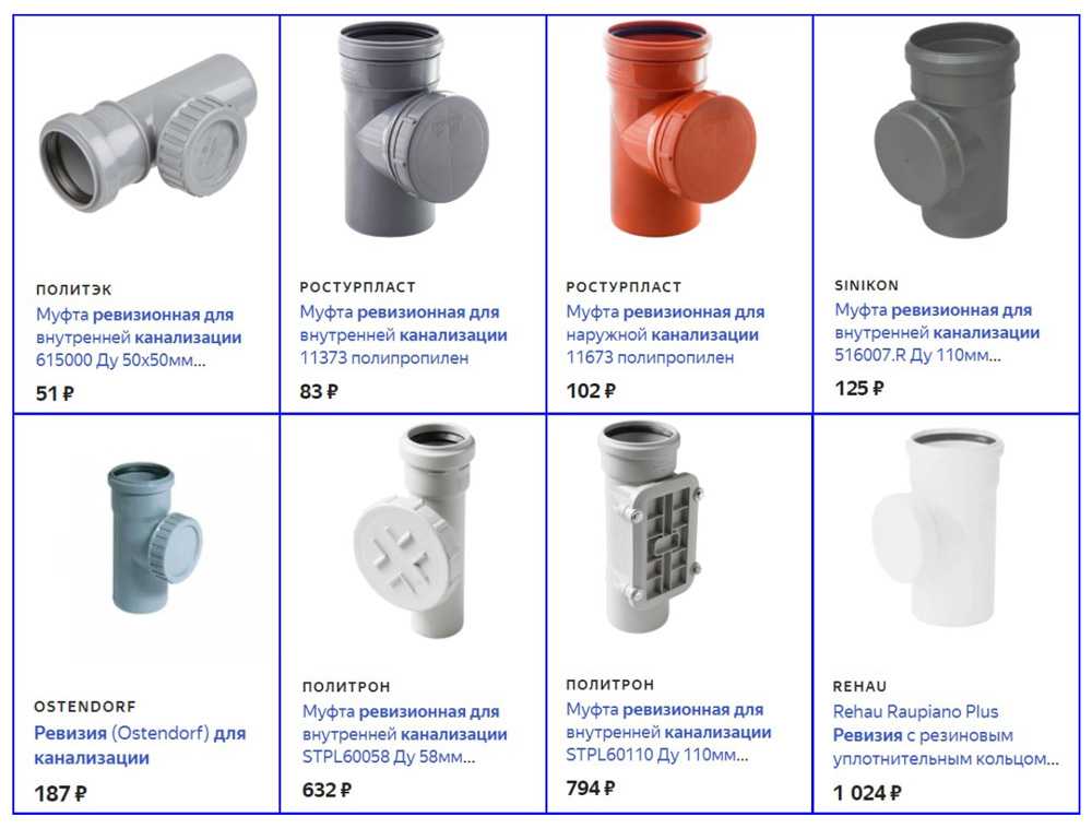 Несомненным лидером является полипропиленовое изделие. Оно способно служить до 50 лет, выдерживать перепады температур и механические нагрузки без разрушений или деформаций. Полипропиленовая ревизия выдерживает нагрев до 950°. Есть типоразмер для канализационных труб диаметром 50 мм (горизонтальная часть системы, к которой подключаются ванны, раковины, кухонные мойки и т.д.), и диаметром 110 мм (для унитазов и стояков).