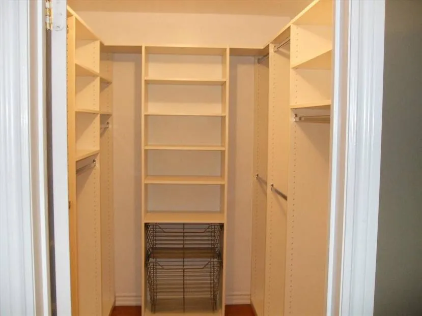 Обычно в гардеробных комнатах предусматриваются шкафы встроенного типа. В мини кладовках это осуществить невозможно. Их заменяют простыми стеллажами и полками.