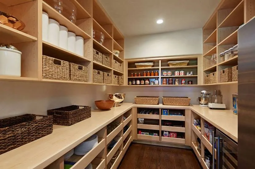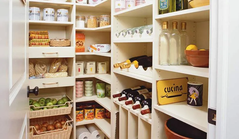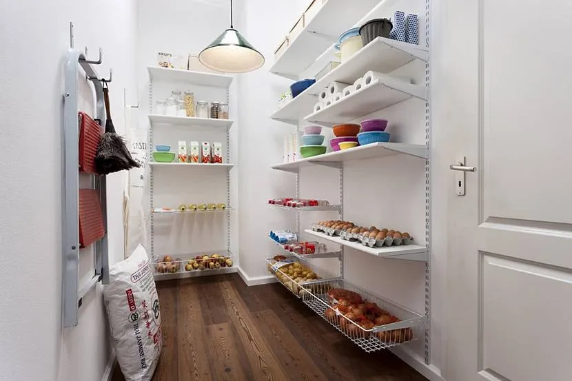 Кроме полок в кладовке стоит использовать крючки, корзины и ящики.
