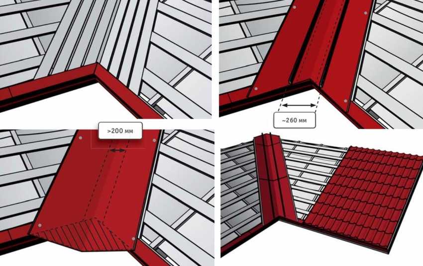 Если конструкция крыши предполагает наличие внутренних углов ската, то их оформление осуществляется с помощью ендовы от конька и вниз до ската. Технология установки ендовы включает ряд важных пунктов, невыполнение которых чревато протечками крыши:
