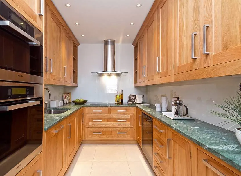 - такую кухню легче подстроить под нюансы квартиры, варьировать расстояние между боковинами, их размерами, заменой одной из них барной стойкой или полуостровом.