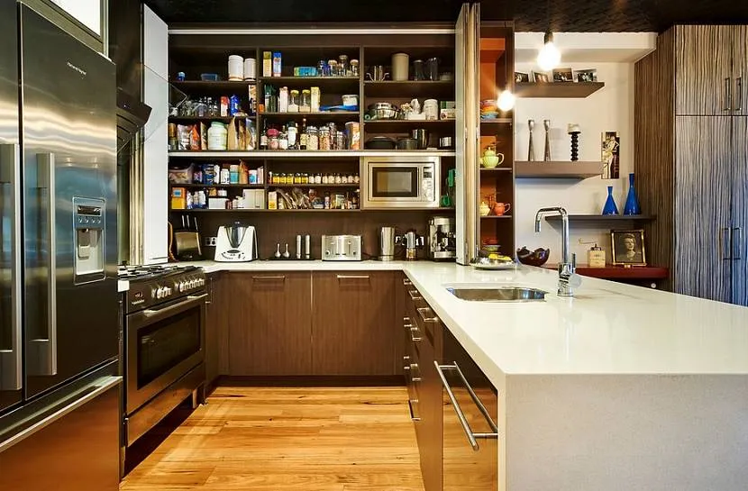 Полочки и шкафчики — это хорошо, но почему бы их не совместить под единой идеей и не создать в нише кладовку? Всё, что используется не часто, выглядит не презентабельно, все запасы продуктов можно легко поставить на полки, положить в корзины и закрыть от посторонних глаз скользящей дверью.