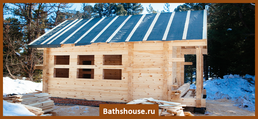 Стены внутри бани обшиваются теплоизоляцией, можно минеральной ватой с алюминиевой фольгой. Чтобы внутрь не затекала вода, можно построить навес или оббить доски толстой полиэтиленовой пленкой, не менее 0,2 мм толщиной, на предварительно набитых рейках контробрешетки.