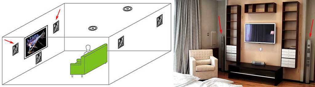 Расположение динамиков для домашнего кинотеатра с системой озвучивания 5-1 показано слева на рис. Его основа – т. наз. рисующие АС (показаны красными стрелками), образующие обычную акустическую стереопару. Настройка 5-1 под комнату производится подбором правильного их расположения, поэтому рисующие АС звука 5-1 встроенными делать не следует, либо нужно изначально проектировать 5-1 под помещение. Для чего требуется полное знание электроакустики в теории и на практике или весьма и весьма значительные денежные средства.