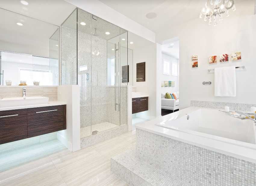 - Освещение в ванной может быть общим или многоступенчатым. С помощью точечных светильников разной мощности, встроенных в натяжной потолок, можно усилить освещение отдельных зон: умывальника, зеркала, туалетного столика.