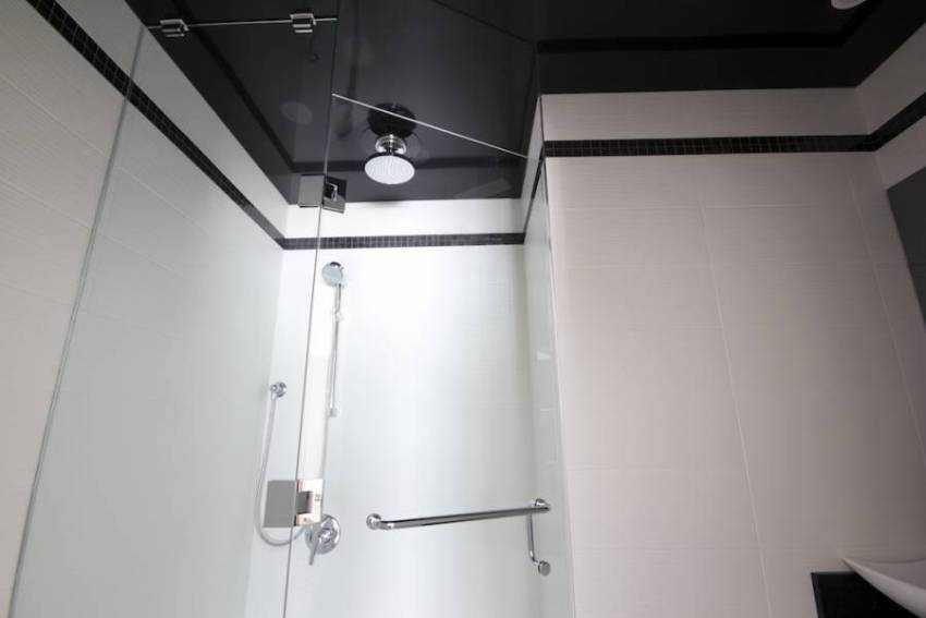 Черный глянцевый потолок красиво смотрится в сочетании с белой керамической плиткой