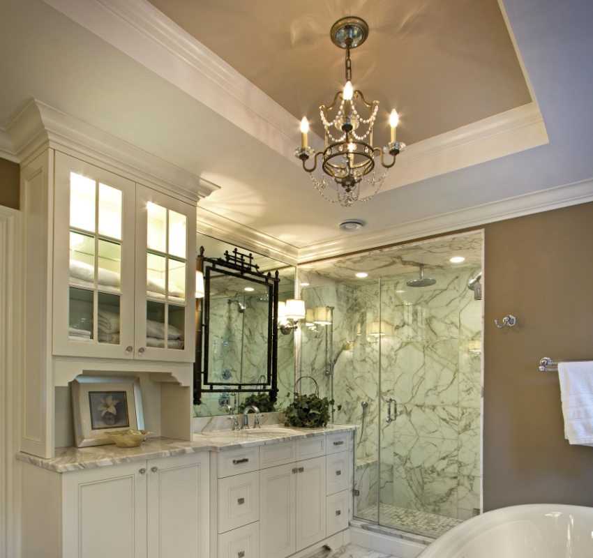 - Многоуровневые конструкции устанавливают обычно в просторных помещениях с высокими потолками или в том случае, когда нужно скрыть коммуникации. Можно понизить уровень потолка над ванной или джакузи, смонтировав в этой зоне уютную подсветку.