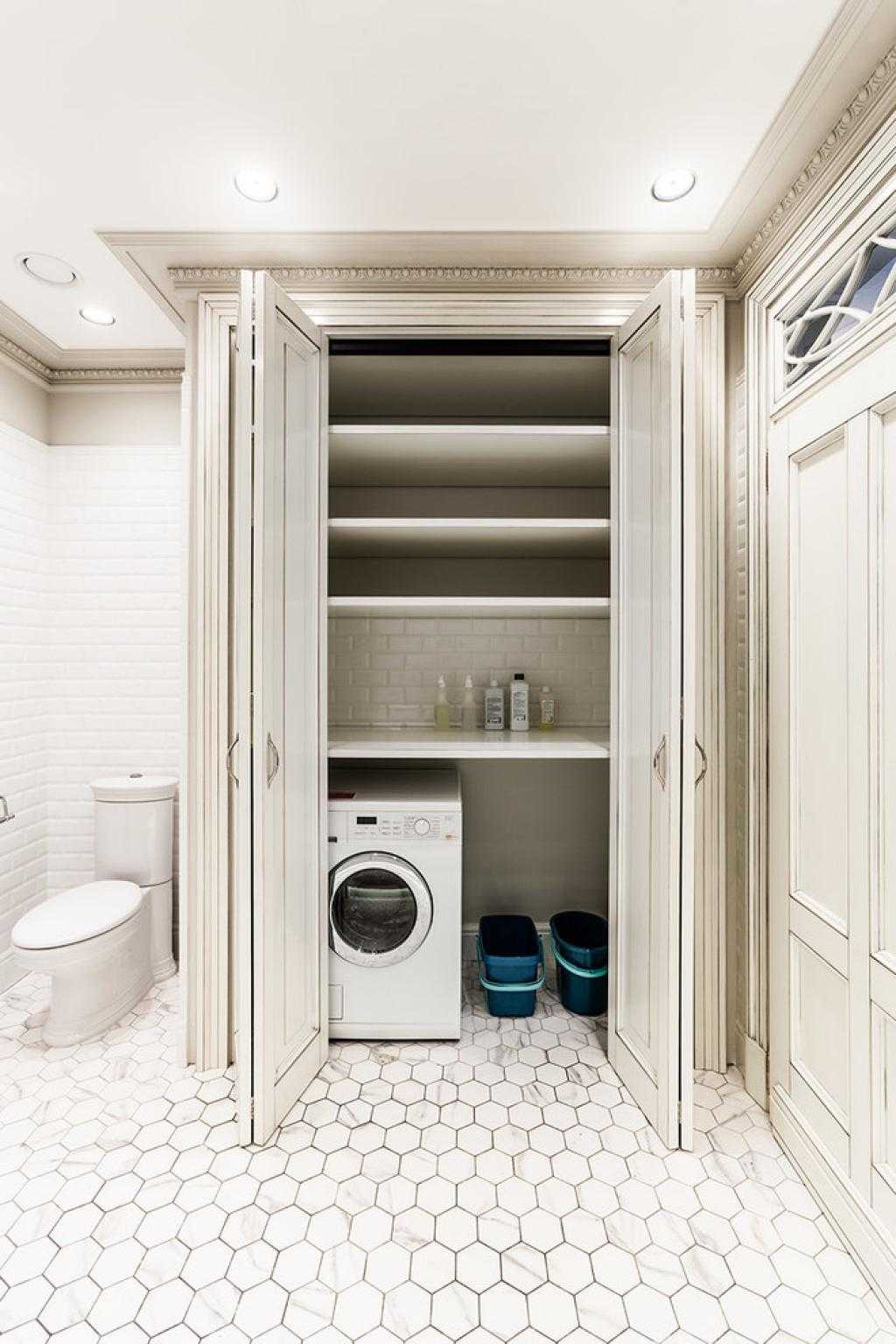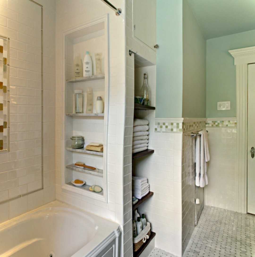 Самый аккуратный вариант. Иногда встроенный шкаф в туалете за унитазом трудно заметить даже на фото. Но это же и самый сложный приём в исполнении, его нужно проектировать на этапе ремонта. Фактически встроенные модели — это ниша.