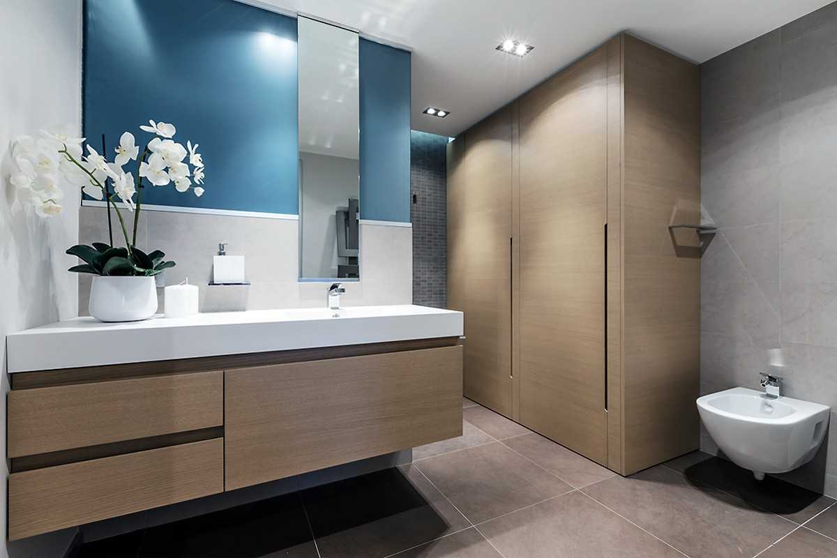 В современном оформлении нередко используется принцип колор-блокинга — выделение цветовых пятен. Этот приём особенно актуален в совмещенных с ванной санузлах. Зону около сантехники выделяют цветом: выкрашивают нишу и шкаф.
