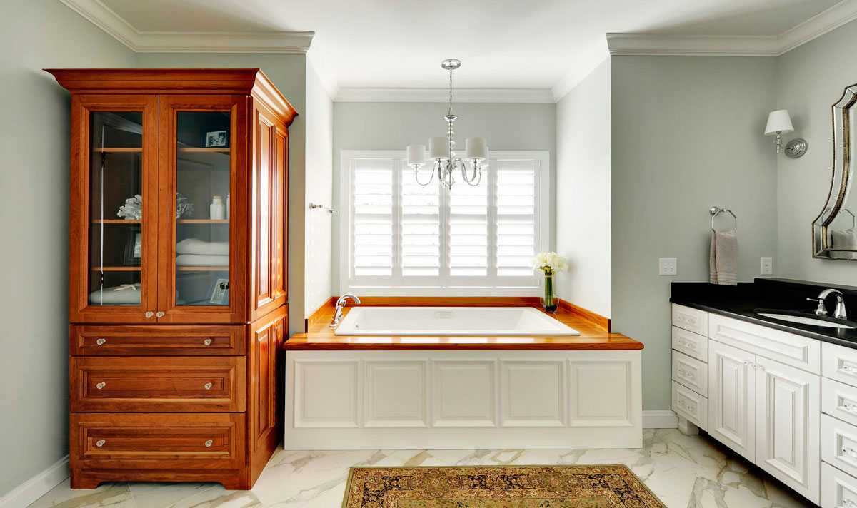Как я уже писала выше — деревянные шкафы в ванной придают комнате особый шарм. А если они еще при этом интересно расположены, то будут радовать глаз вдвойне.