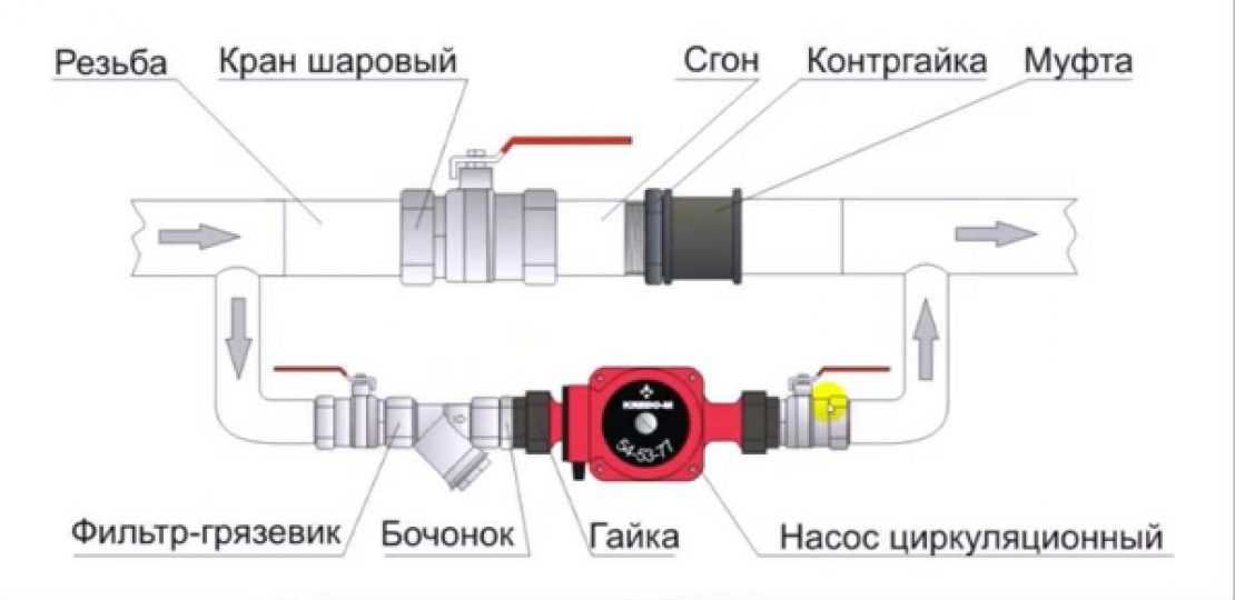 Контуры с принудительной циркуляцией обязательно укомплектовываются насосным оборудованием, которое отвечает за транспортировку теплоносителя. Насос устанавливают на обратном трубопроводе перед насосом