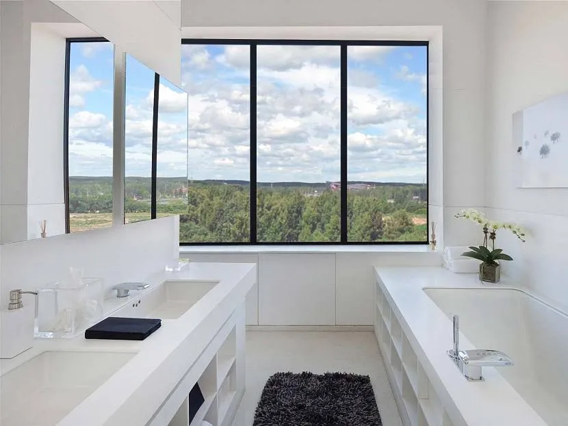 - Французское или панорамное остекление. Такое больше подходит для просторной ванной комнаты (от 6 квадратов и выше). Есть смысл размещать такое окно только в случае, если из него просматривается красивый вид на улице. Характерны такие пейзажи для загородных домов или элитных коттеджей.