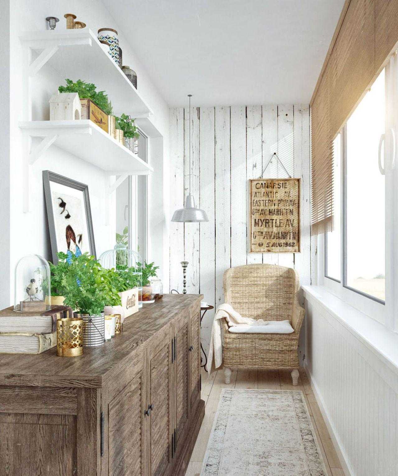 Если у помещения конкретной цели нет, по боковым стенкам балкона можно организовать полки легкой конструкции для различных мелочей, коробок, живых цветов или книг. Главное условие – никаких стеллажей, только светлые тона и умеренное заполнение пространства.