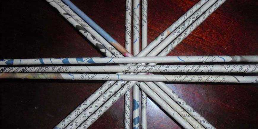 - Плетем дно изделия. Для него используем 12 трубочек. Кладем крест-накрест. Следите за расстоянием между трубочками.