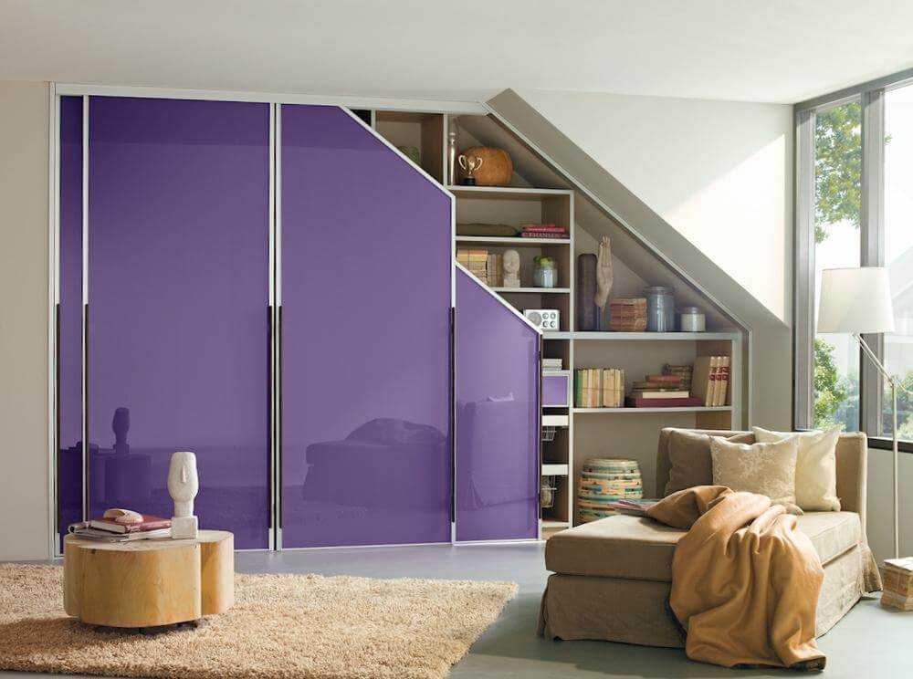 . Если у стены есть неровность (скос), встроенная конструкция поможет ее скрыть. Верхняя линия шкафа, повторяющая наклон потолка, подчеркнет уникальность мансардного помещения и создаст впечатление законченности обстановки.