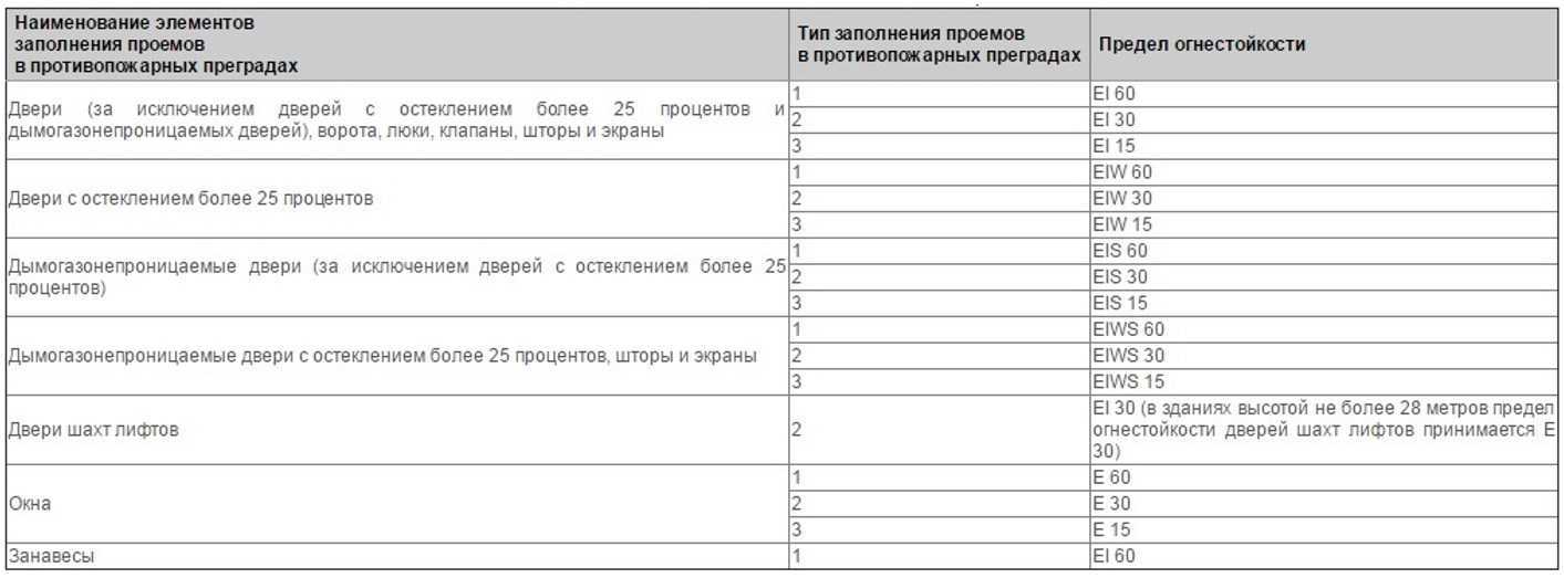 Талица 3: Предел огнестойкости конструкций, заполняющих проемы (окна, двери, ворота) в противопожарных преградах