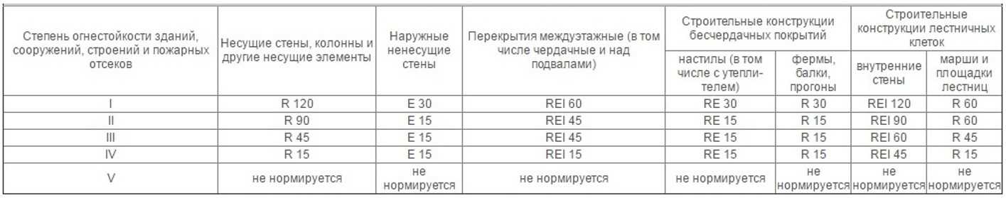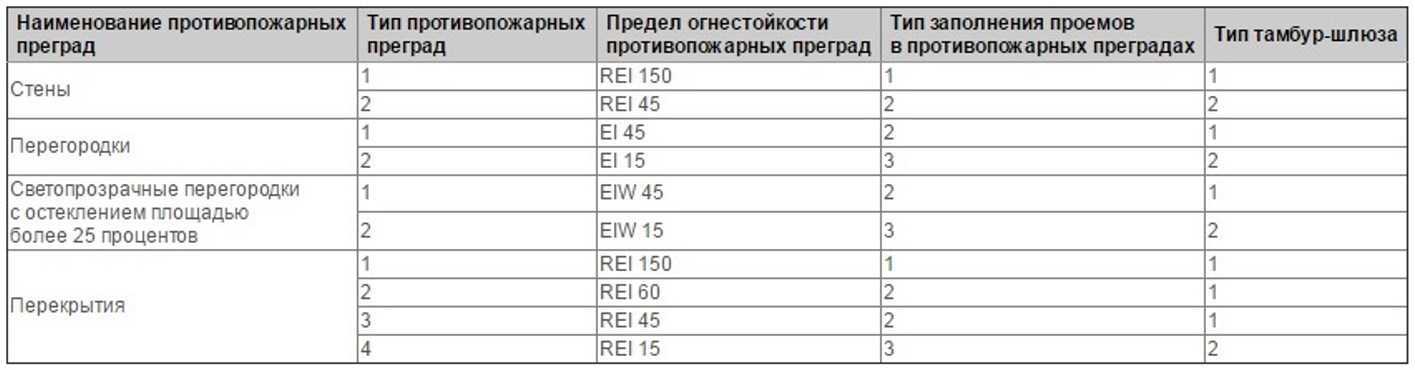 Талица 2: Предел огнестойкости противопожарных преград, специальных строительных конструкций, используемых для локализации возгорания
