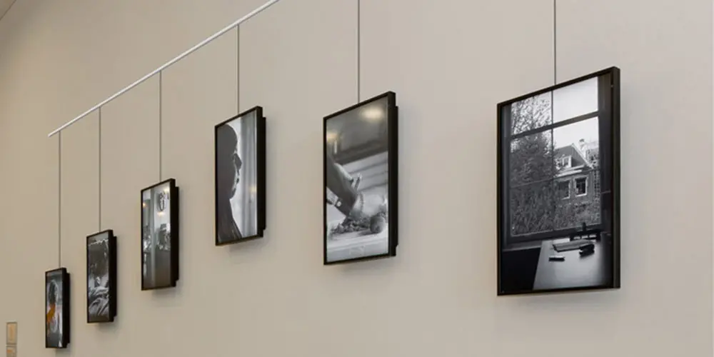 Для такой системы необходим монтаж потолочного рельса и подвеса из лески для изображений.