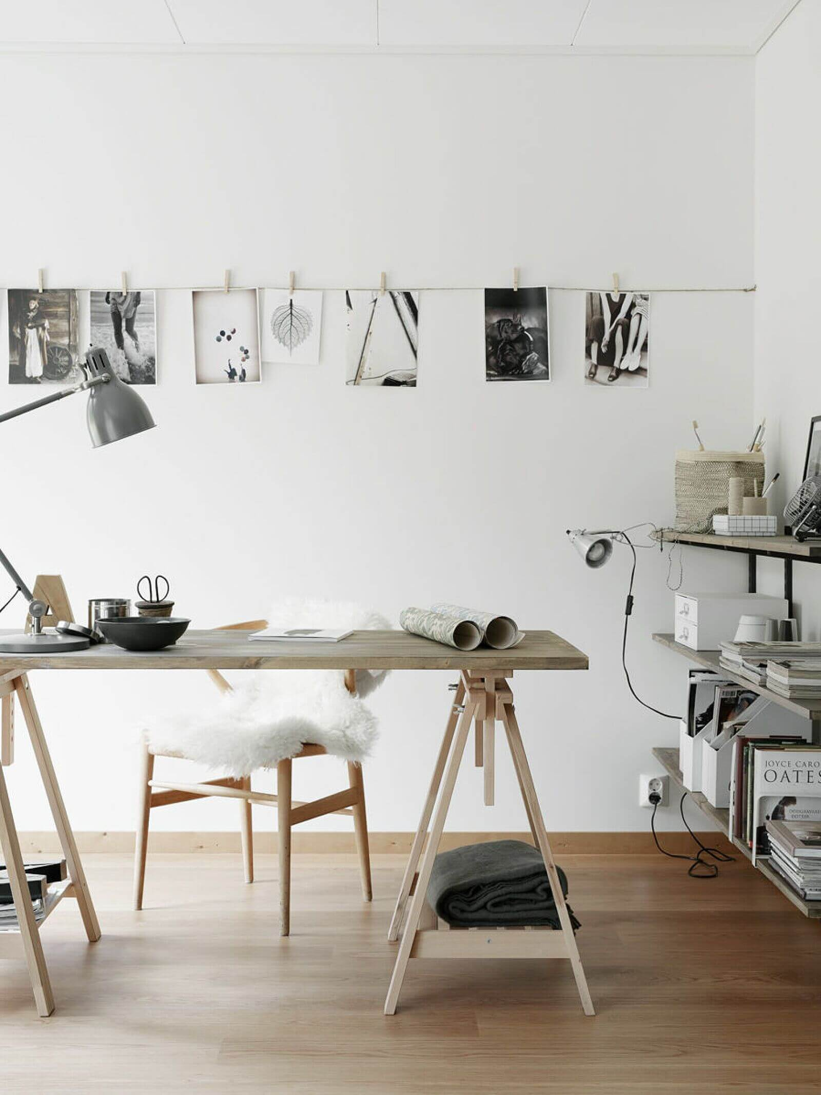 С помощью прищепок и веревки несложно организовать небольшую галерею, закрепив вдоль стены жгут и разместив на нем изображения.