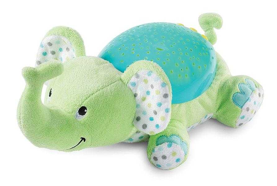 Проектор звездного неба для детей сделан в виде плюшевого слона. Работает в трех цветовых режимах: синий, красный, зеленый. Синий светит ярче остальных цветов. Изображение на потолке получается не слишком отчетливым, немного рассеянным, но для малышей это способствует быстрому засыпанию. Выбор из трех колыбельных мелодий, звук льющейся воды, сердцебиение. Громкость регулируется. Можно настроить режим звучания на 15-45 минут.