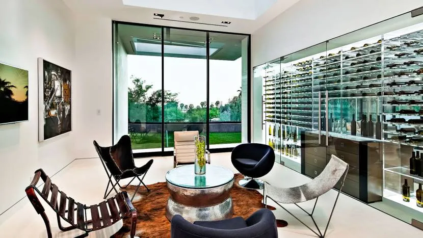 Если вам не нравятся стилизации под исторические интерьеры, комнату можно оформить в современном стиле. Для этого достаточно установить винный шкаф со стеклянными дверцами, поставить современный стол со стеклянной столешницей и окружить его удобными современными стульями.