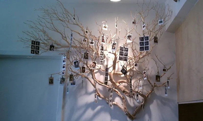 Основой для фотографий могут послужить ветви настоящего дерева. Достаточно их надежно прикрепить к стене, после чего навесить нити, к которым в дальнейшем привязать снимки. Очень интересен дизайн с использованием чёрно-белых многокадровых изображений.