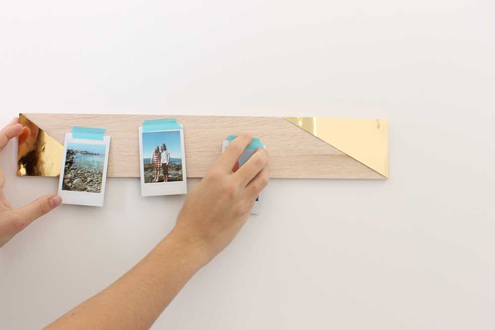 Затем расположите фотографии на одном большом куске фанеры и сверху положите готовое «окно». Если фотографии легли ровно, их можно закрепить с помощью клея или двустороннего скотча перед тем, как вешать раму на стену.