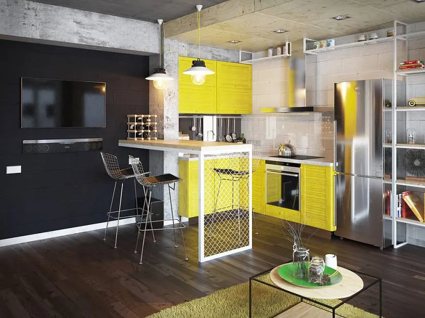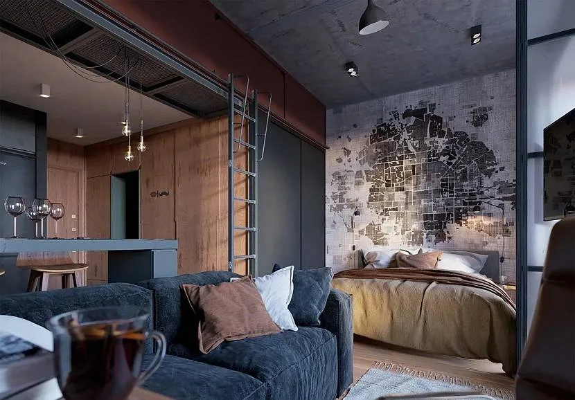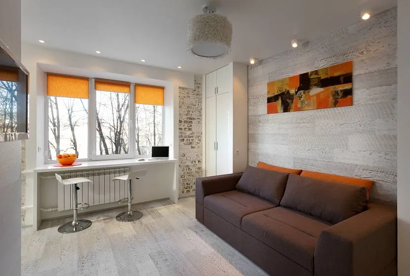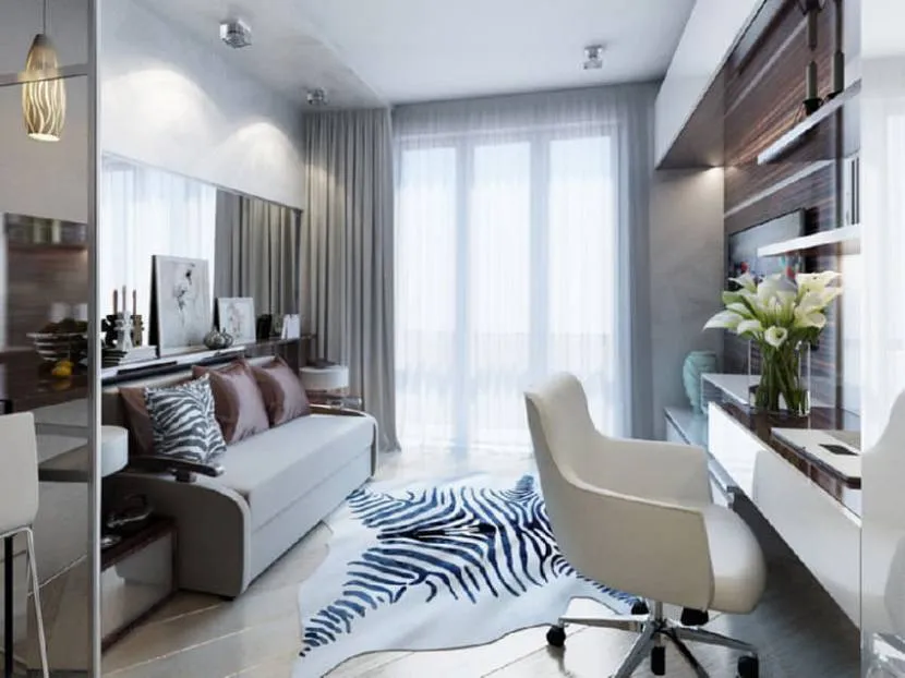 Частой ошибкой обустройства небольшого интерьера является акцент на кровати. Она не должна быть установлена у входа. Лучше всего выделить место в дальней части. На остальной площади разместите кухню и гостиную. Отделить место для готовки можно с помощью барной стойки или низкой перегородки.