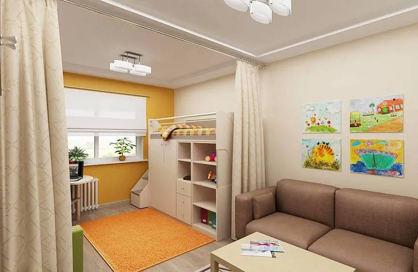 - занавески. Помимо практической пользы они помогут оформить внутреннее убранство комнаты. В этом случае лучше воздержаться от тяжёлых штор и отдать предпочтение лёгким полупрозрачным занавескам светлых тонов. При желании можно взять и более яркие занавески с небольшим цветным рисунком.