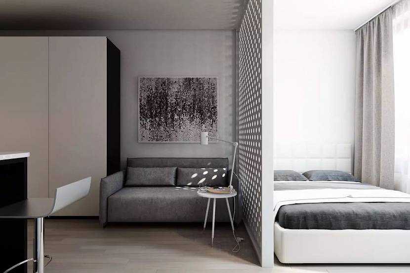 Для одного человека отделять спальную часть необязательно. А вот для двух и более жильцов стоит создать уголок для отдыха и уединения. Использование в небольшом помещении глухой перегородки не желательно, так как она съест пространство и будет сильно выделяться. Лучше всего воспользоваться ширмой, открытым стеллажом или ажурной перегородкой. Также вы можете использовать шторы или установить прозрачную раздвижную дверь.