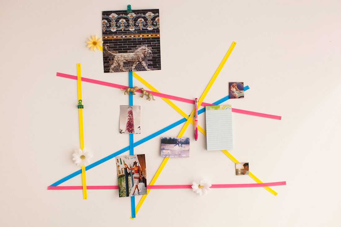 На самом деле это тип геометрического искусства, в который входят и мемо-доски. Вам потребуются липучки для мини-крепежей, яркий скотч, маленькие золотые гвозди и молоток.