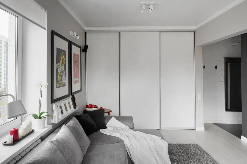 Дизайн маленькой комнаты 12 кв м с диваном просто не обойдется без системы хранения. При этом выбрать подходящую модель шкафа довольно сложно, ведь в тесном помещении любой шкаф будет выглядеть гораздо больше, чем он есть на самом деле. Чтобы хоть немного исправить положение дизайнеры рекомендуют выбирать встроенные шкафы по всей стене от пола до потолка. Еще одной деталью, облегчающей жизнь в небольшой квартире, являются двери-купе (в идеале зеркальные или с матовым стеклом).