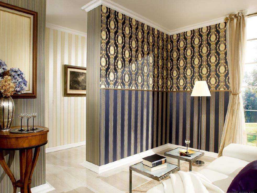 Зонирование выполняется за счет игры контрастов: разные цвета, фактуры и рисунки. Обои, как правило, стыкуют в углах. Это позволяет отказаться от молдингов и замаскировать места соединения.