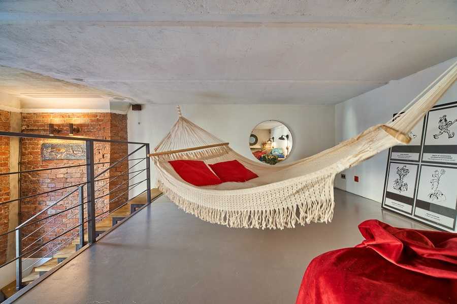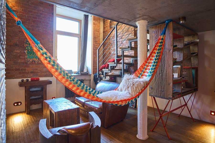 Подвесной разноцветный гамак в интерьере лофт гостиной