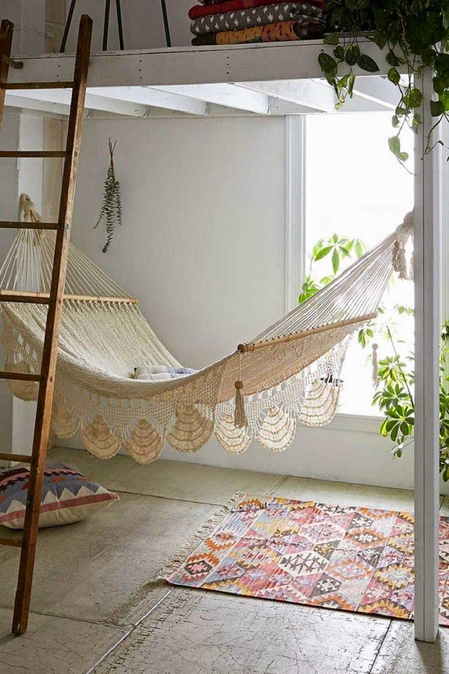 Подвесной бежевый гамак из хлопка на антресольном этаже