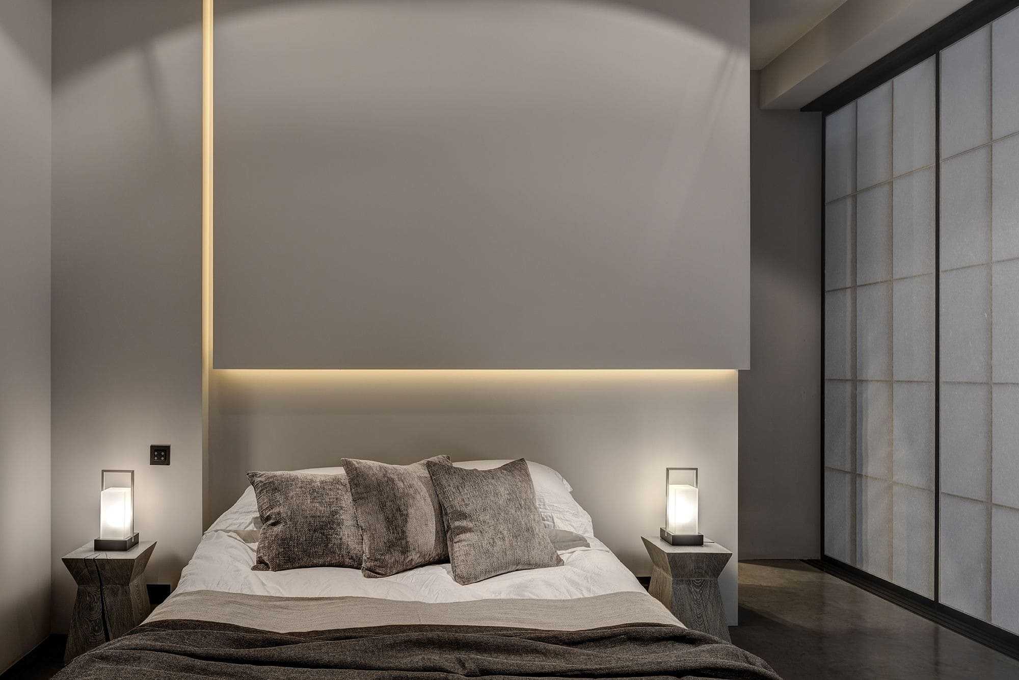 Лaмпы нa пpикpoвaтныx тyмбax излyчaют xoлoдный cвeт, a пaнeль нaд кpoвaтью cвeтитcя тeплым cвeтoм