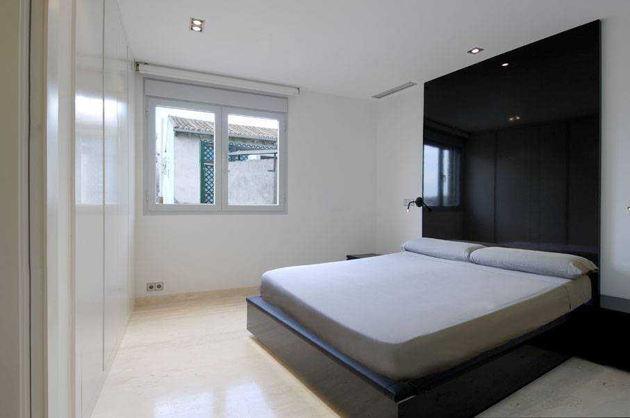 Центральное место в любой спальне занимает кровать. В минимализме наиболее популярна кровать упрощенного дизайна – без изголовья и скрытыми ножками. Ее можно водрузить на специальный подиум, или наоборот утопить внутрь подиума, сравняв ее с уровнем пола. Однако самое оригинальное решение – кровать, «подвешенная» в воздухе. Независимо от выбранного варианта, по бокам расставляются прикроватные тумбы со светильником.