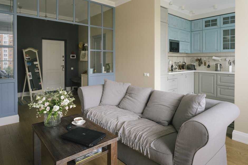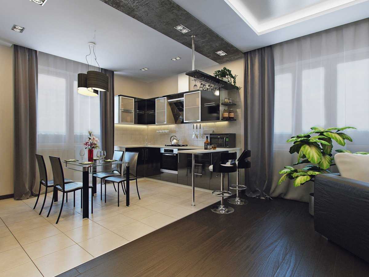 Однако при такой перепланировке неизбежно возникает вопрос, как разделить зону кухни и гостиной. Они не должны сливаться.