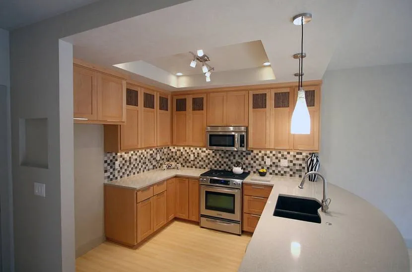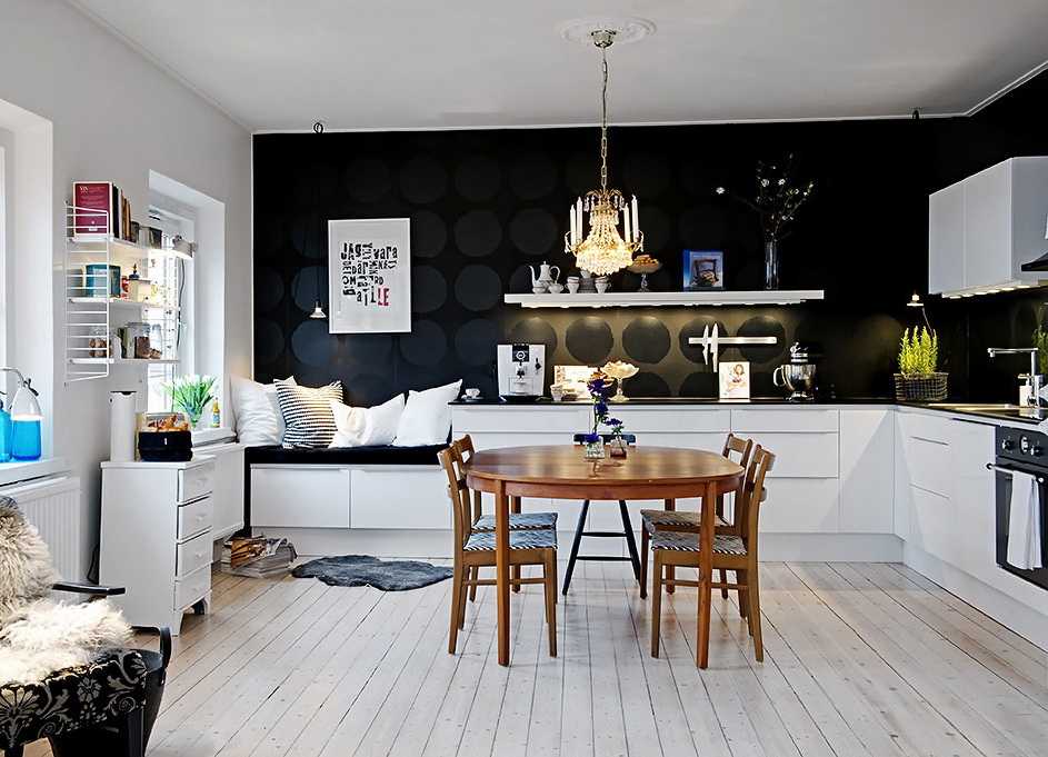 В оформлении дизайна лучше не использовать темные тона, например, черный, гранатовый, так как они поглощают свет. Предпочтение отдается светлым цветам – белому, серому, молочному. Подойдет оттенок, приближенный к цвету природного дерева, который добавит обстановке тепла. Также разрешено использование ярких акцентов, которые встречаются в обивке мебели, коллекционной посуде, контрастной столешнице.