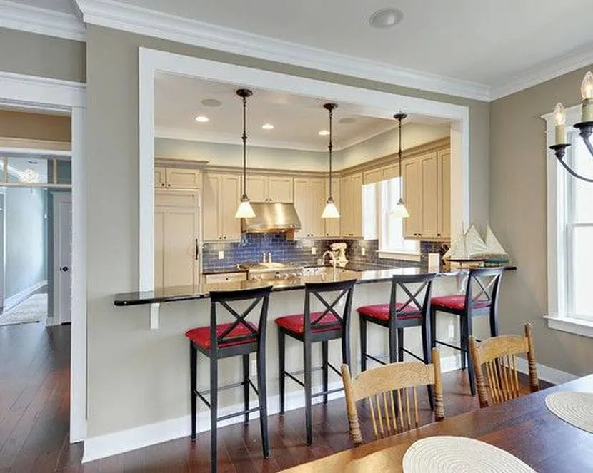 Раздаточное окно – неплохое решение для изолированной кухни-ниши, расположенной в гостиной или на кухне-прихожей, смежной с жилой комнатой. Кстати, такой проем очень удобно оборудовать барной стойкой как показано на фото ниже.