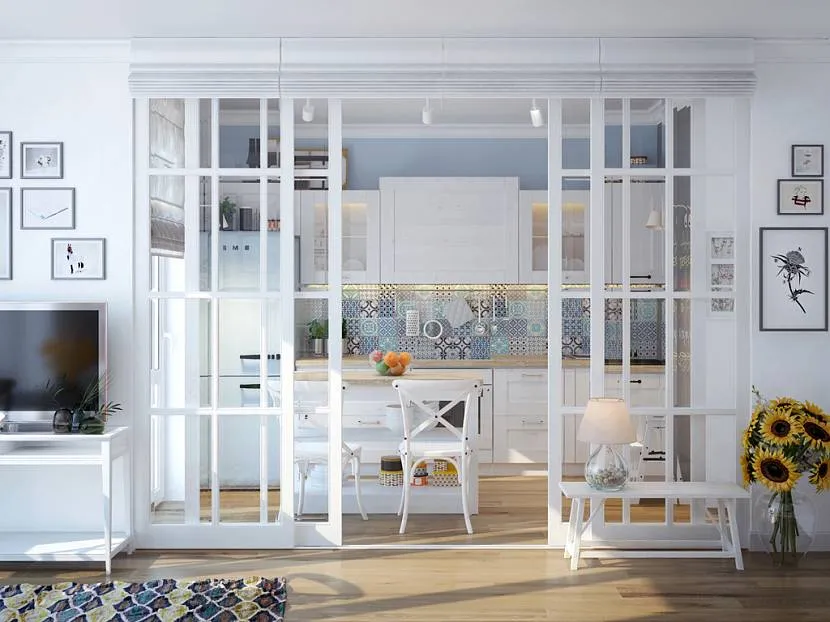 Раздвижные двери. Они могут быть глухими или прозрачными. Главное их достоинство — возможность надежно изолировать кухню во время кулинарных экспериментов.