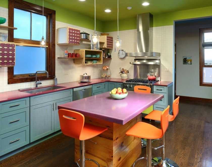 . Если говорить о том, как организовать рабочую зону на кухне, то обычно стараются делать ее неконтрастной с обеденной. При оформлении же кухни-гостиной можно использовать и очень яркие контрастные оттенки. Например, красиво и необычно будет смотреться светлая гостиная и темная кухня. Также можно разграничивать цвет мебели на кухне и гостиной.