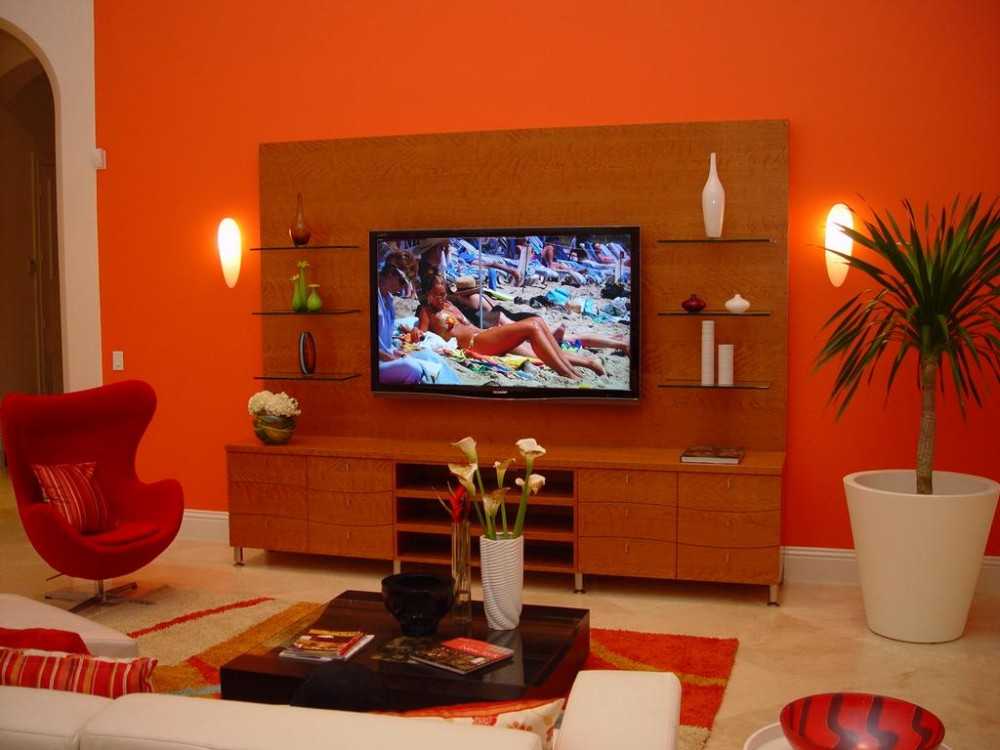 В зале современной квартиры будут уместны красный ковер, накидка на диван, красная однотонная стена или мебель.