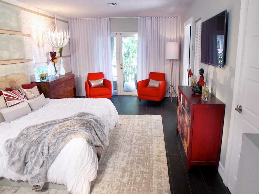 Для достижения такого эффекта необязательно менять цвет всей мебели. Можно добавить красный плед, поставить торшер или ночные лампы с абажурами того же цвета и поставить мягкое алое кресло. Варианты оформления смотрите на фото красной мебели для спальни.