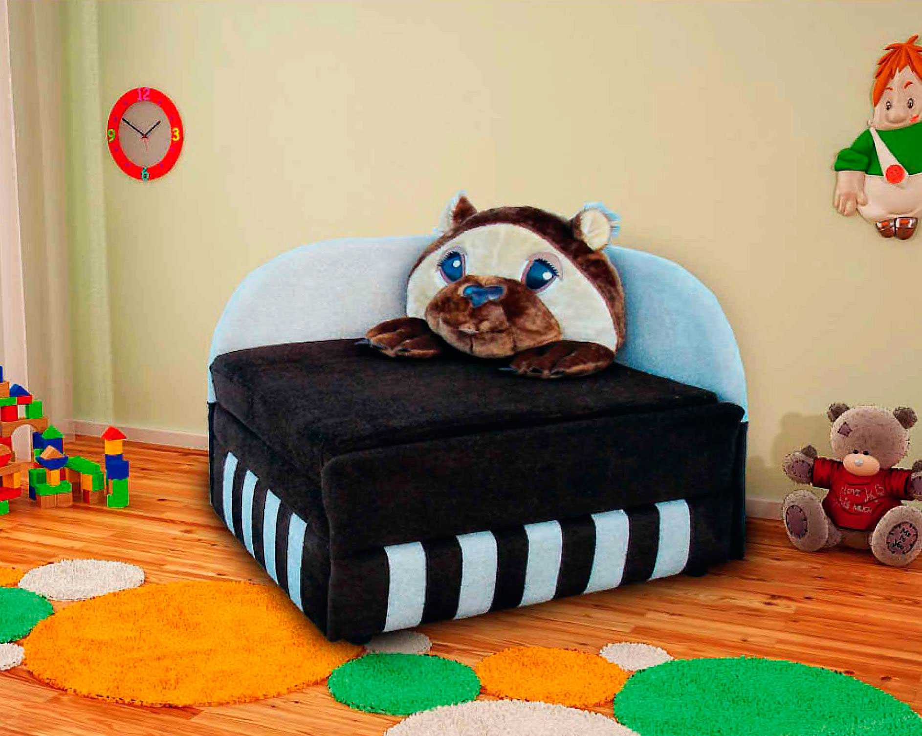 - Для детей. Компактные модели удобны для ночного отдыха и дневных игр. Для обивки используются яркие ткани, на поверхность наносятся изображения по мотивам сказок и мультфильмов. При катастрофической нехватке места в детской можно установить кресло-кровать миниатюрных размеров.