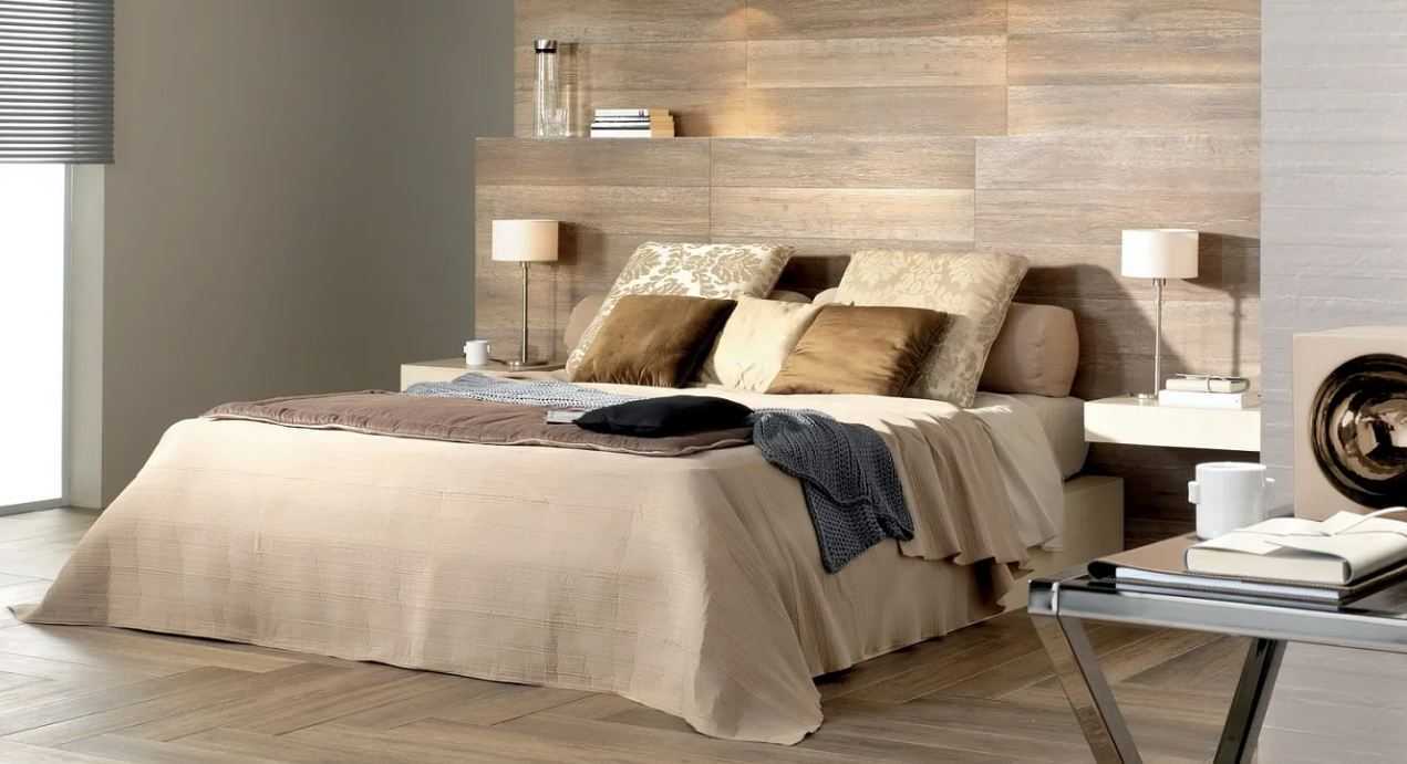 Дизайн спальни, со стеной отделанной ламинатом, выделяется своей новизной и современностью на фоне других устаревших вариантов отделки. Посмотрите сами.