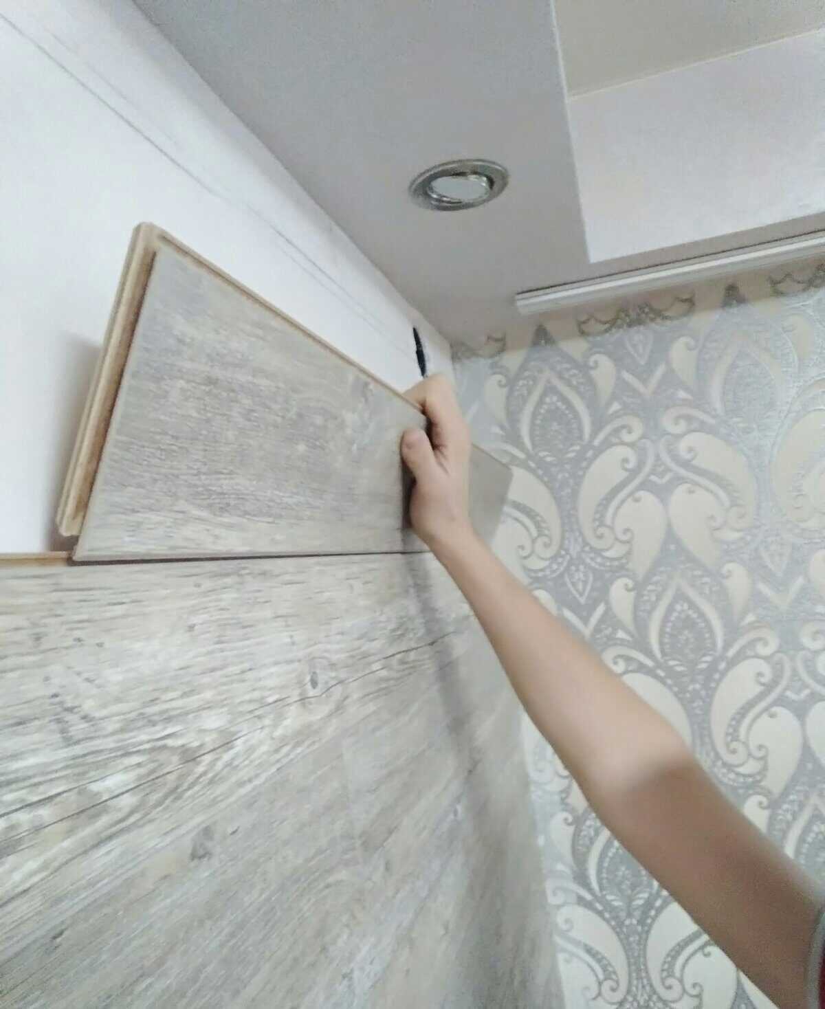 - Нельзя производить процесс установки на кривые, неровные стены, поэтому предварительно их чистят, штукатурят, просушивают. Либо подготавливают обрешетку. Также еще один возможный вариант – ламинат положить самостоятельно на стену из гипсокартона. Гипсокартон при этом должен быть надежно соединен со стеной.